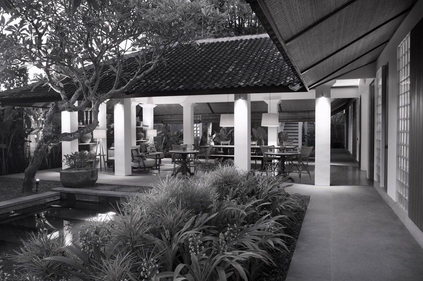 AtelierTE or Tirta Ening means “clear water”. The garden is designed around mature frangipani trees and landscaped with fragrant and insect repelling plants. Atelier’s long and deep pool keeps the water cool. The bale bengong  is a secluded place to relax or work.